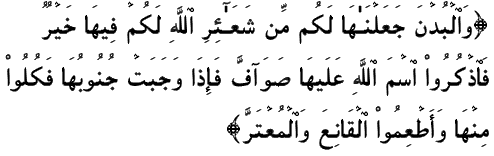 (The sacrificial camels We have made for you as among the Symbols from Allah: in them is (much) good for you: then pronounce the name of Allah over them as they line up (for sacrifice): when they are down on their side (after slaughter), eat ye thereof, and feed such as (beg not you) live in contentment and such as beg with due humility.)[Soorat-ul-Hajj ayah 36]