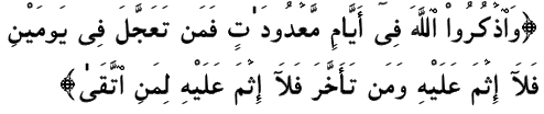 (Celebrate the praises of Allah during the Appointed Days, but if anyone hastens to leave in two days, there is no blame on him, and if anyone stays on, these is no blame on him if his aim is to do right,) However remaining for the third day's stoning is better as it is the Sunnah.(103)